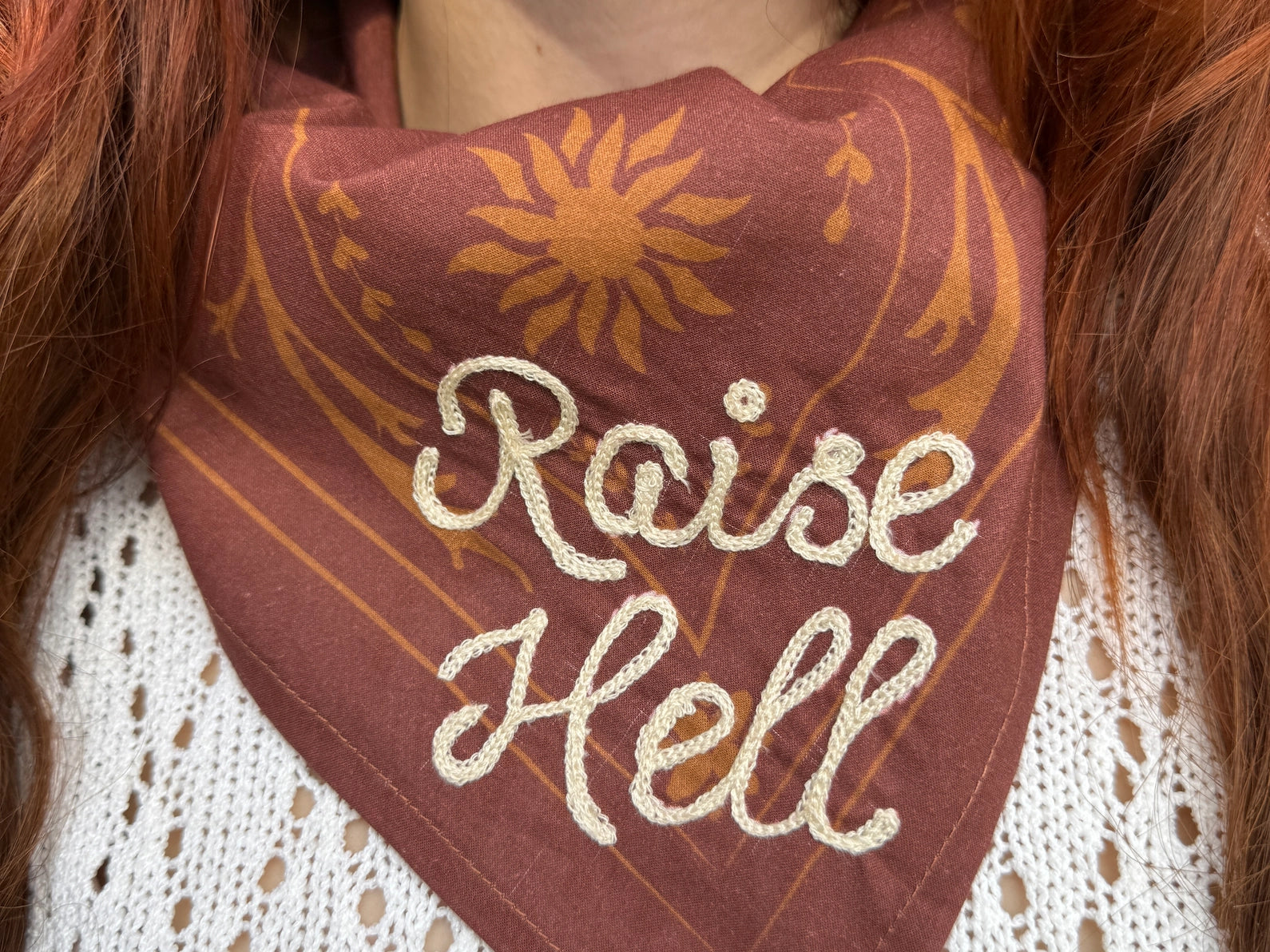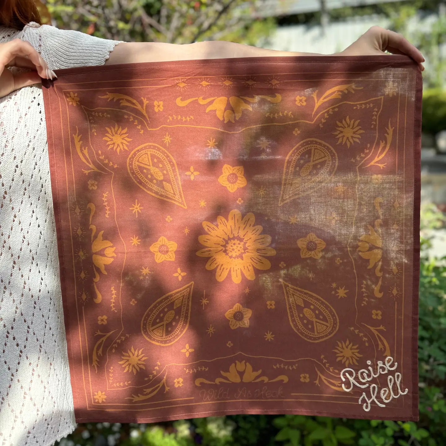 The Raise Hell Bandana features the classic Wild As Heck bandana print with a hand embroidered/chain stitched Bluebonnet detail. Hand screen printed in India. This incredibly high quality bandana is made from 100% GOTS certified organic cotton voile. Bandanas are hand stamped/screen printed and hand embroidered in India.