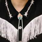 This li'l bolo tie is comprised of: 1.5" Hard Enamel Charm Gold Plated Tips and Bolo Back 32" Vegan Leather Cord. You're sure to be the talk of the town with this shiny little tie, paired with your favorite collared shirt or dress - or no collar. Wearing a bolo is easy as pie and you'll look darn cute no matter how you wear it!