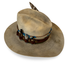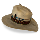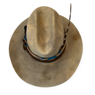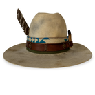 Some hats feel like they already know the road. Desert Psalm is one of them. Hand-shaped from premium beaver felt in a sun-worn sand tone, it carries the warmth and grit of the desert itself. The tall cattleman crease gives it structure and presence, while the 4-inch flanged brim adds just enough shade to disappear into. A turquoise-and-cream Pendleton wool band wraps the crown, finished with a weathered leather strap, brass rivets, and a single feather tucked by the concho.