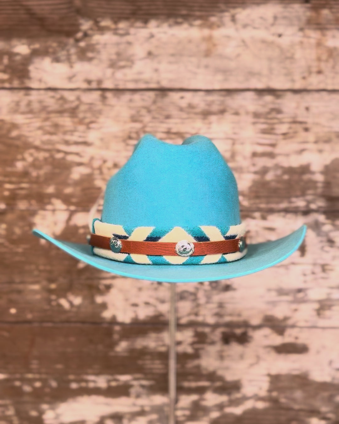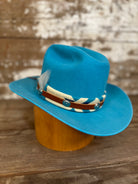 Built for bluebird days and big imaginations, the Sky Scout is a scaled-down version of a classic Western silhouette- same craftsmanship, smaller footprint. The turquoise felt captures that high-altitude clarity, while the Pendleton wool band, concho accents, and hand-stitched mountain embroidery nod to Oregon’s mountains.