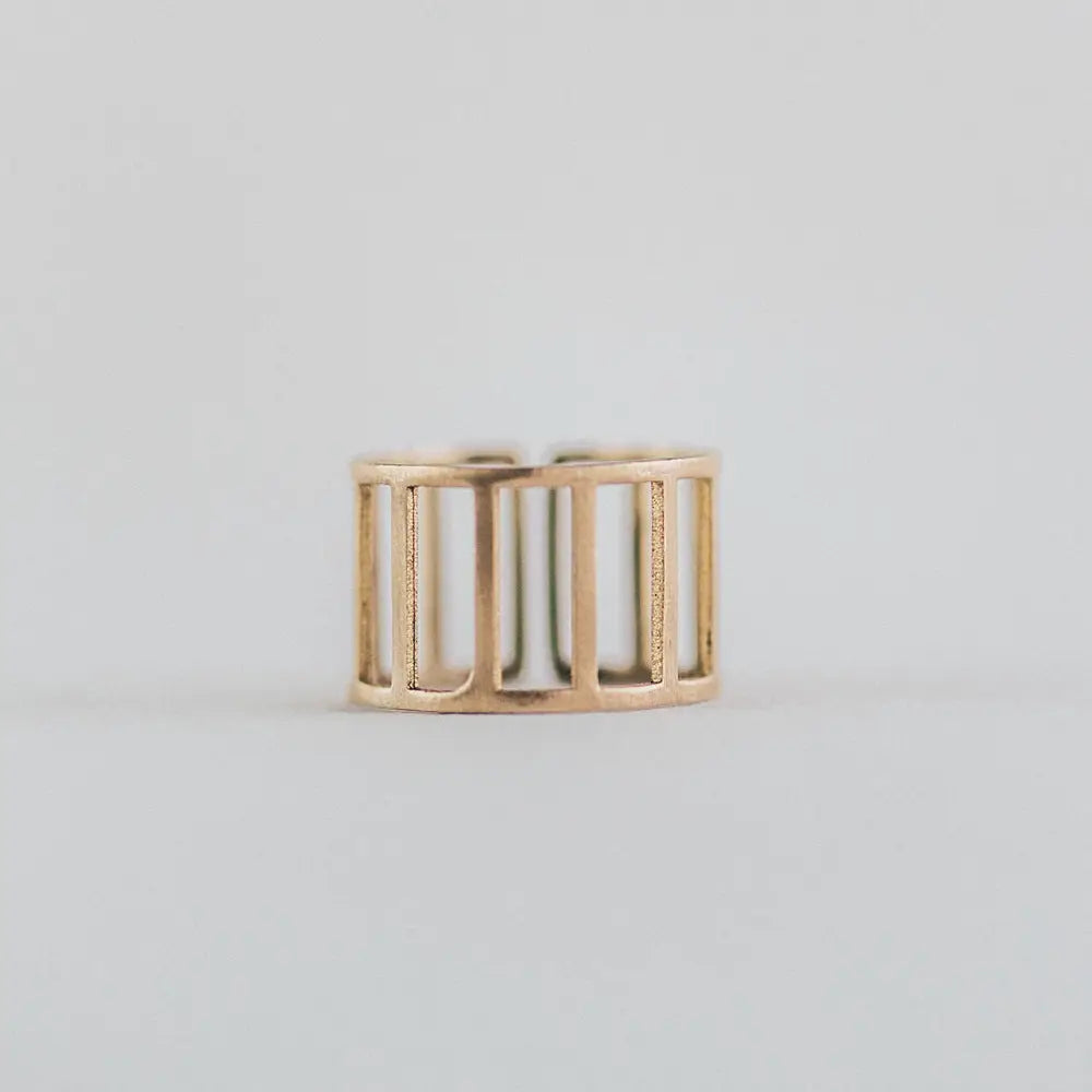 Aviary Ring - 13mm from Commonform, a brand committed to handcrafted quality and unique design, embodies a minimalist style perfect for formal occasions. This individual piece is ethically sourced, crafted from solid brass and adjustable to fit a size 6. The bronze hue captures the essence of spring, offering a solitaire ring that is as unique as it is elegant. Packaged in recyclable material, this ring is a testament to our belief in good design for everyone. Made with love in Bozeman, Montana.